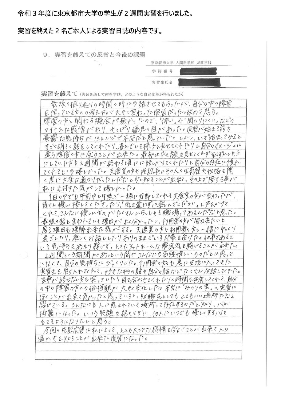 • 東京都市大学実習生による実習日誌